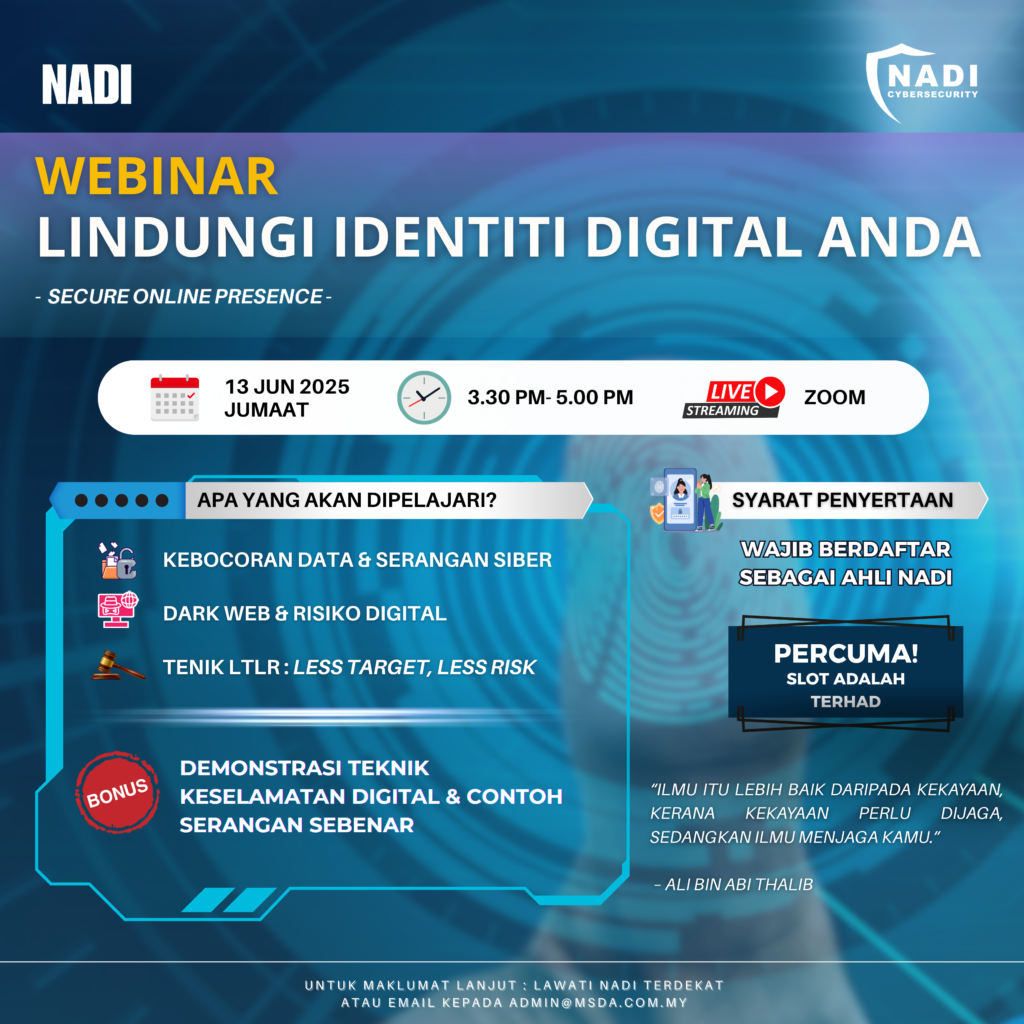 Jemputan untuk menyertai Webinar NADI x Cybersecurity bertarikh 13 Jun 2025 yang bertajuk Lindungi Identiti Digital Anda.